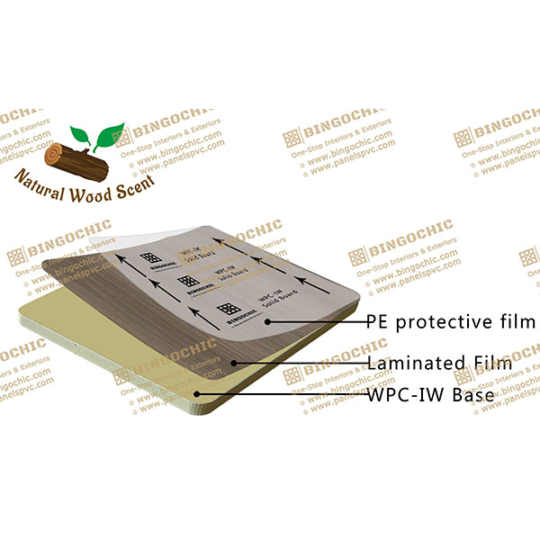 Она состоит из трех частей: основа Wpc -IW + ламинированная пленка + защитная пленка PE.