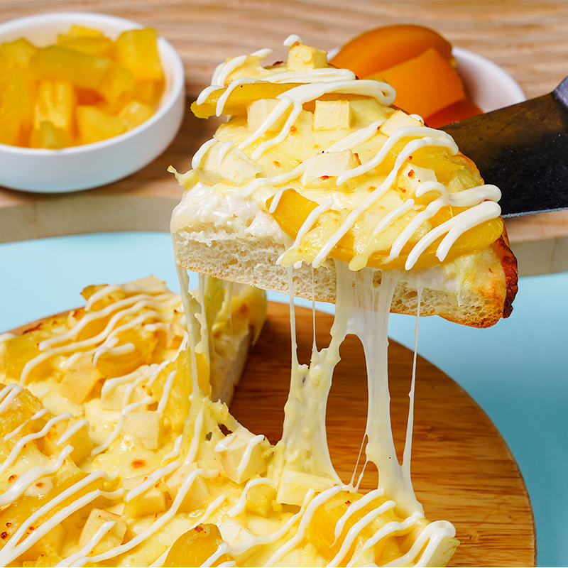 Состав: Пшеничная мука, жёлтый персик, яблоко, груша, ананас, тёртый сыр моцарелла (сырный продукт), питьевая вода, майонез, растительное масло, кулинарный жир, сухое цельное молоко, дрожжи, сахар, соль, витамин С, стевиолгликозиды