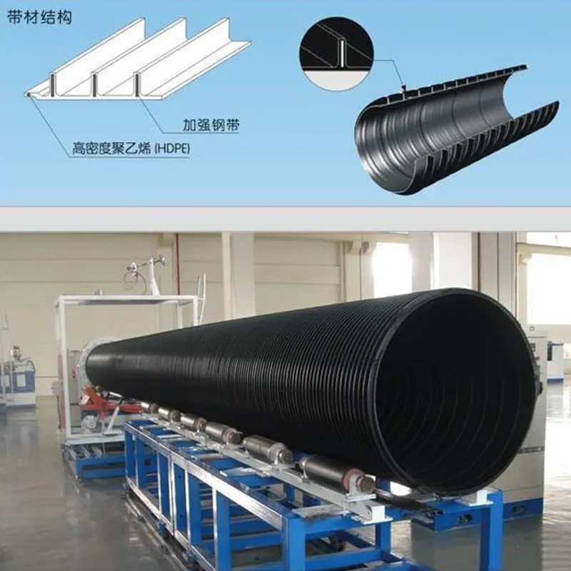 Пластиковые трубы из полиэтилена высокой плотности со спиральной намоткой (SRWPE) изготавливаются путем спиральной намотки и сварки (экструзионной сварки на поверхности перекрытия) стально-пластиковых композитных профилированных полос. Их внутренняя поверхность гладкая и ровная, размеры варьируются от DN200 до DN2600 мм. Эта труба обладает такими преимуществами, как коррозионная стойкость, легкая конструкция, простота монтажа, высокая пропускная способность и длительный срок службы (50 лет). Она служит экологически чистой альтернативой энергоемким материалам (бетону, чугуну, стекловолокну, керамике и т. д.) и считается экологически чистым продуктом. Спирально-навитые композитные трубы из ПЭНД представляют собой высокотехнологичный композитный трубопроводный продукт, разработанный с использованием собственных прав интеллектуальной собственности Китая, который соответствует ведущим мировым стандартам в области экологической устойчивости и энергоэффективности. Эти трубы, в основном используемые в качестве подземных дренажных трубопроводов, сочетают в себе жесткость стальной ленты с коррозионной стойкостью, низким коэффициентом трения и износостойкостью, присущими полиэтилену.