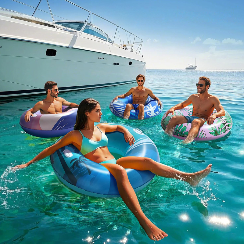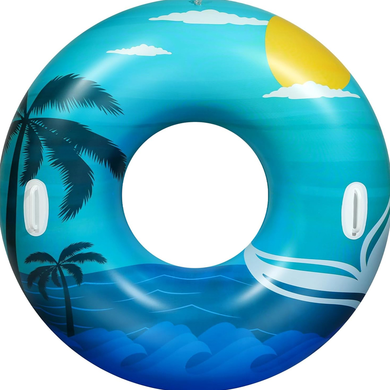 Этот надувной круг для плавания синего цвета, освежающего морского цвета и украшенный изображениями кокосовых пальм, волн и солнца, излучает атмосферу отпуска. Визуальный эффект переносит на островной пляж, мгновенно пробуждая тоску по солнцу и морю. Изготовленный из высококачественного, экологичного ПВХ, он плотный и прочный. В надутом состоянии он приобретает объёмную, яркую форму и яркие цвета. Он не только обеспечивает комфортное плавание, но и станет незаменимым аксессуаром для летних вечеринок у бассейна и пляжного отдыха.