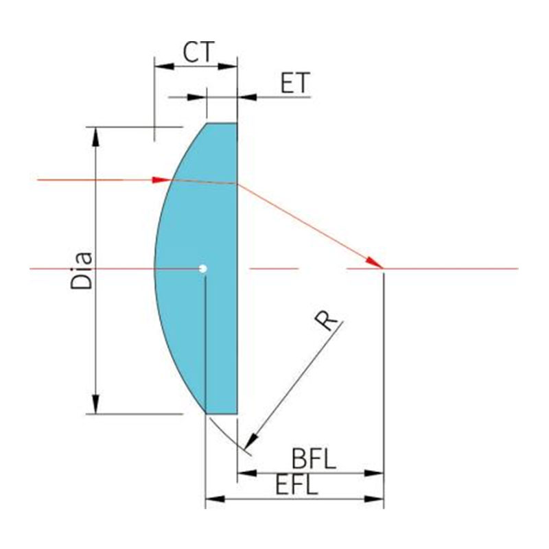 Плосковыпуклая линза состоит из одной выпуклой поверхности и одной плоской поверхности и имеет положительное фокусное расстояние. Обычно он используется в таких приложениях, как сужение луча, уменьшение фокусного расстояния или увеличение изображения. Чтобы получить меньшую сферическую аберрацию, при использовании плосковыпуклой линзы для фокусировки коллимированного светового пучка световой луч должен падать на изогнутую поверхность линзы; при использовании ее для коллимации точечного источника света световой луч должен падать на плоскость.