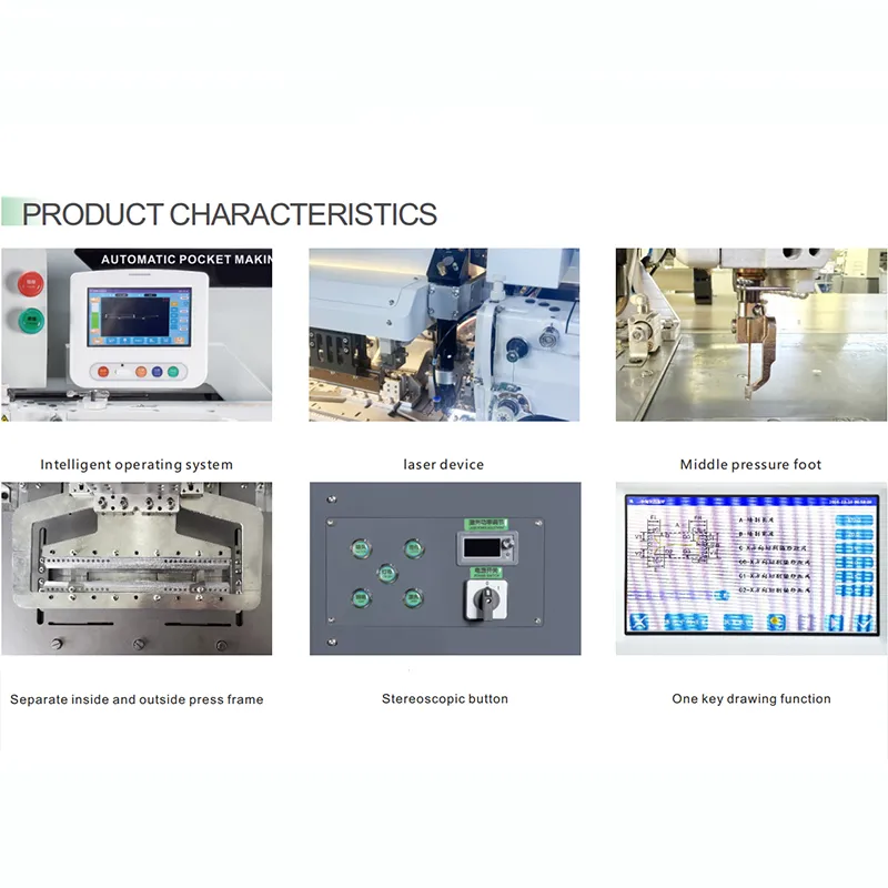 1.Специализируется на различных применениях для открытия карманов: однослойные карманы, двуслойные карманы, карманы на молнии. Многофункциональная быстрая смена штампа позволяет формировать карманы за один проход; сложные процессы могут потребовать повторной подачи материала. Подходит для 80% задач по открытию карманов, подходит для различных тканей, включая трикотаж, тканые материалы, эластичный трикотаж и деним.