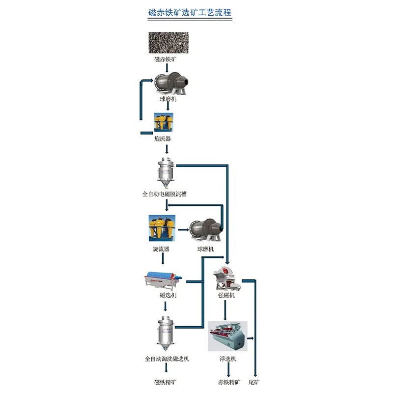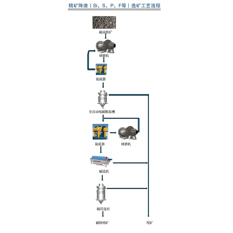По сравнению с промывочным магнитным сепаратором, высота сепарационной емкости промывочного илоотделителя снижена примерно на 30%, что делает его более подходящим для обработки пульпы с крупной гранулометрией, высоким содержанием шламов и низким содержанием железа. Он часто используется на начальной стадии грубого обогащения в качестве оборудования для обесшламливания, обезвоживания и сгущения. Замена барабанных магнитных сепараторов, магнитных илоотделителей и обезвоживающих желобов на промывочный илоотделитель может оптимизировать процесс обогащения. Установка промывочного илоотделителя перед гидроциклонами и высокочастотными грохотами повышает эффективность классификации; установка перед мельницей может значительно увеличить производительность мельницы и содержание железа в питании; установка перед промывочным магнитным сепаратором может дополнительно повысить конечное содержание железа в концентрате.