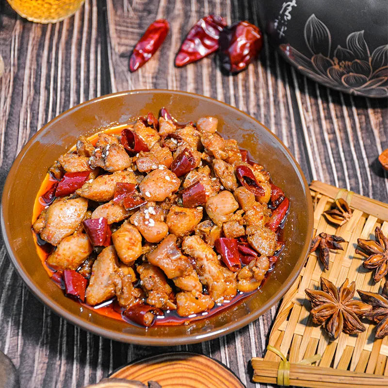 Главная звезда — кролики, выращенные на свободном выгуле в горах Бачжуна. Их мясо плотнее, чем у кроликов в клетках, с ноткой дикой сладости. Свежезабитые и нарезанные на кусочки размером с большой палец, они обеспечивают плотное укус, не будучи ни жесткими, ни ломкими, и отлично впитывают приправу.