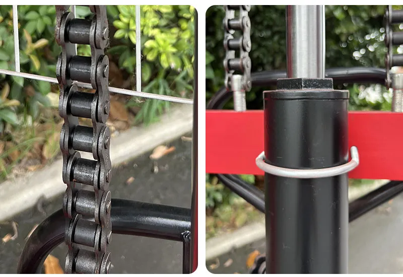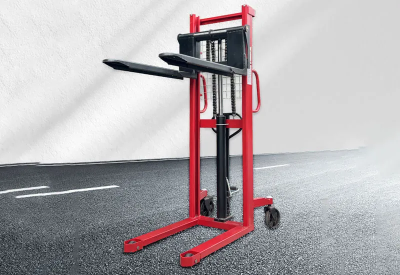 Гидравлический цилиндр через направляющие колеса с обеих сторон рычага приводит в действие усиленную цепь большой тяговой способности, поднимая вилы, утолщенная и удлиненная цепная база обеспечивает устойчивость груза.