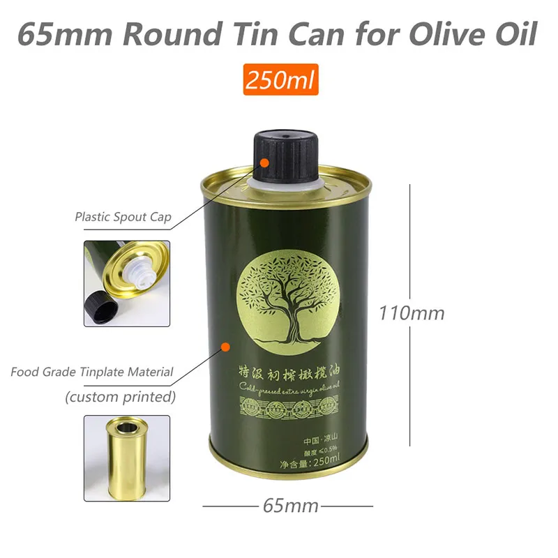 Откройте для себя наш универсальный контейнер для оливкового масла объемом 250 мл, круглую жестяную банку, изготовленную из пищевой жести. Индивидуализируемые цвета и доступны различные размеры диаметра. Напрямую от производителя по оптовым ценам и с быстрой доставкой.