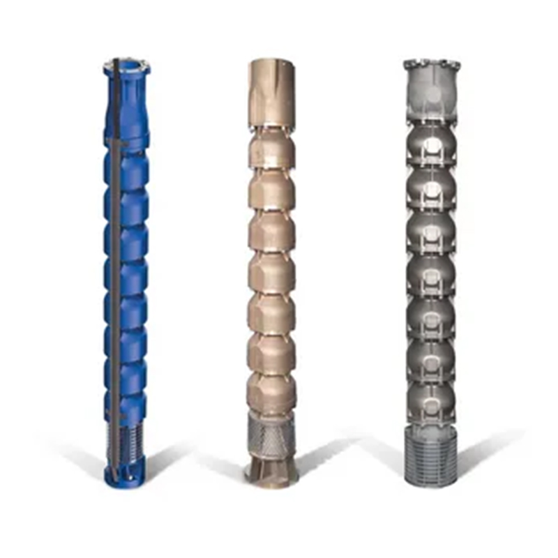 2.Двигатель герметичной конструкции с водяным заполнением. Обмотка статора выполнена из водостойкого многожильного эмальпровода с изоляцией из полиэтилена и защитной оболочкой из нейлона. Опорные и упорные подшипники используют водяную смазку. Внутренняя полость двигателя заполнена чистой водой для охлаждения и смазки подшипников. В нижней части двигателя установлена компенсационная мембрана (из резины) для регулировки перепада давления при тепловом расширении воды. На верхней части вала установлен песочный фильтр, предотвращающий попадание песка внутрь корпуса.