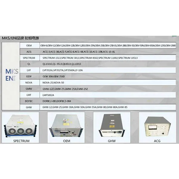 Новые изделия RF generator относятся к совершенно новым продуктам генераторов радиочастоты, эти продукты используются для подачи радиочастотной мощности в оборудовании для производства полупроводников. Они обладают передовыми технологиями и эффективной способностью вывода мощности. Подержанные изделия относятся к уже использовавшимся генераторам радиочастоты, которые после проверки и тестирования могут быть проданы повторно. Услуги по ремонту RF generator представляют собой услуги по ремонту и техническому обслуживанию уже использовавшихся генераторов радиочастоты. В процессе ремонта могут проводиться диагностика неисправностей, замена поврежденных компонентов, повторная калибровка и другие операции для восстановления нормальной работы оборудования, при этом осуществляется сотрудничество с брендами AE, MKS/ENI, COMDEL/KYOSAN, DAIHEN и согласующими устройствами, а также с услугами по ремонту источников питания постоянного тока.