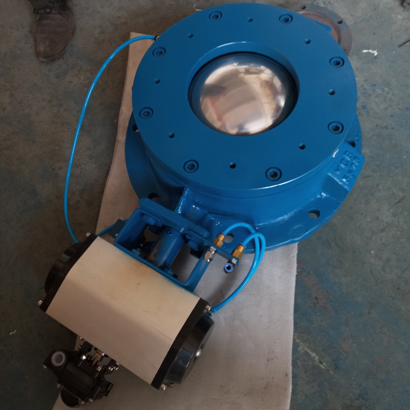 Пневматический исполнительный механизм купольного клапана с секторным пневмоцилиндром представляет собой секторный пневмоцилиндр. Благодаря компактным размерам, он подходит для работы в узких пространствах со сложными эксплуатационными условиями, обеспечивая эффективную экономию пространства. Его клапанный сердечник представляет собой сферический купол. В процессе открытия и закрытия между клапанным сердечником и резиновым уплотнительным кольцом сохраняется зазор около 2 миллиметров, движение осуществляется бесконтактным способом, цель — уменьшение износа. Уплотнение изготовлено из специально разработанной резины, встроенной в куполообразное седло, которое расширяется, компенсируя износ.