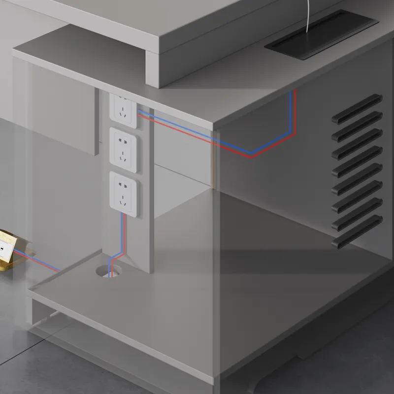 Комплектация: скрытые направляющие, дверные петли с демпфером, многофункциональный кабельный органайзер, цифровой кодовый замок, отверстие под розетку 86 в дополнительном шкафу.