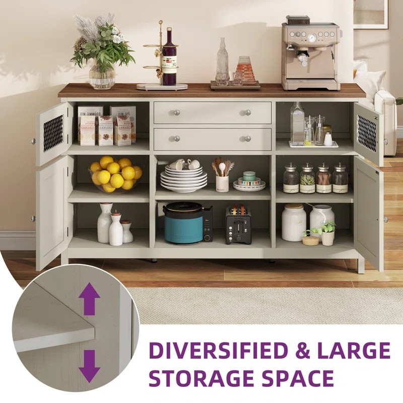 УВЕЛИЧЬТЕ ПРОСТРАНСТВО ДЛЯ ХРАНЕНИЯ: в нашем шкафу для кофе есть 8 полок и верхняя часть шириной 59 дюймов, где вы можете разместить кофеварку, микроволновую печь или выпечку. Регулируемые полки вместят громоздкие или высокие предметы, а два ящика спрячут столовые приборы. Сетчатая дверца позволяет легко доставать предметы.