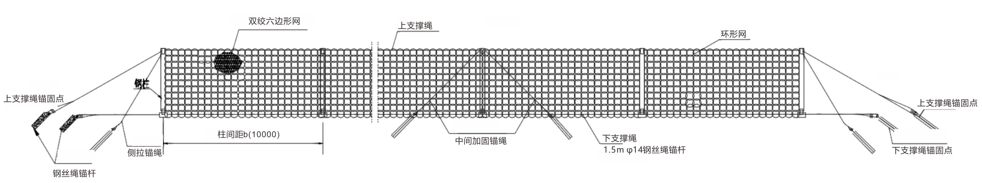 В основном он состоит из стальных колонн, верхних и нижних опорных канатов, анкерных стержней, анкерных канатов, намоточных кольцевых сетей, скрученных шестиугольных сетей, устройств потребления, скоб и других компонентов. Инновационная конструкция независимо заменяемых структурных компонентов может быть легко заменена отдельно в течение срока службы продукта. Компоненты, которые выходят из строя после перехвата камнепада, могут быть быстро восстановлены до нормальной эффективности защиты.