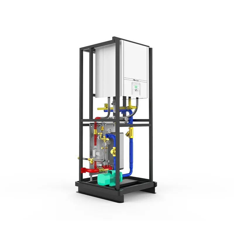Малый блочно-модульный теплоисточник KAZIS состоит из полностью предварительного смешения высокоэффективного конденсационного газового водонагревательного котла, циркуляционного насоса котла, теплообменника, расширительного бака, вторичного циркуляционного насоса, шкафа управления, трубопроводов, дымохода (опционально), арматуры, приборов, корпуса и других компонентов.