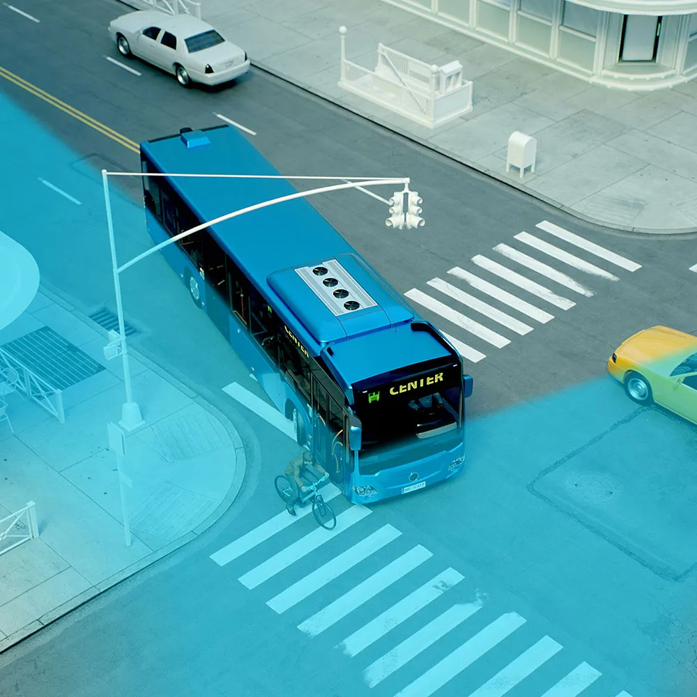 Опираясь на системы мониторинга и предупреждения о слепых зонах слева и справа, эта система включает в себя предупреждение о слепых зонах спереди и сзади. Она комплексно решает проблему предотвращения столкновений для крупных пассажирских и грузовых транспортных средств, устраняя слепые зоны в поле зрения на 360 градусов.