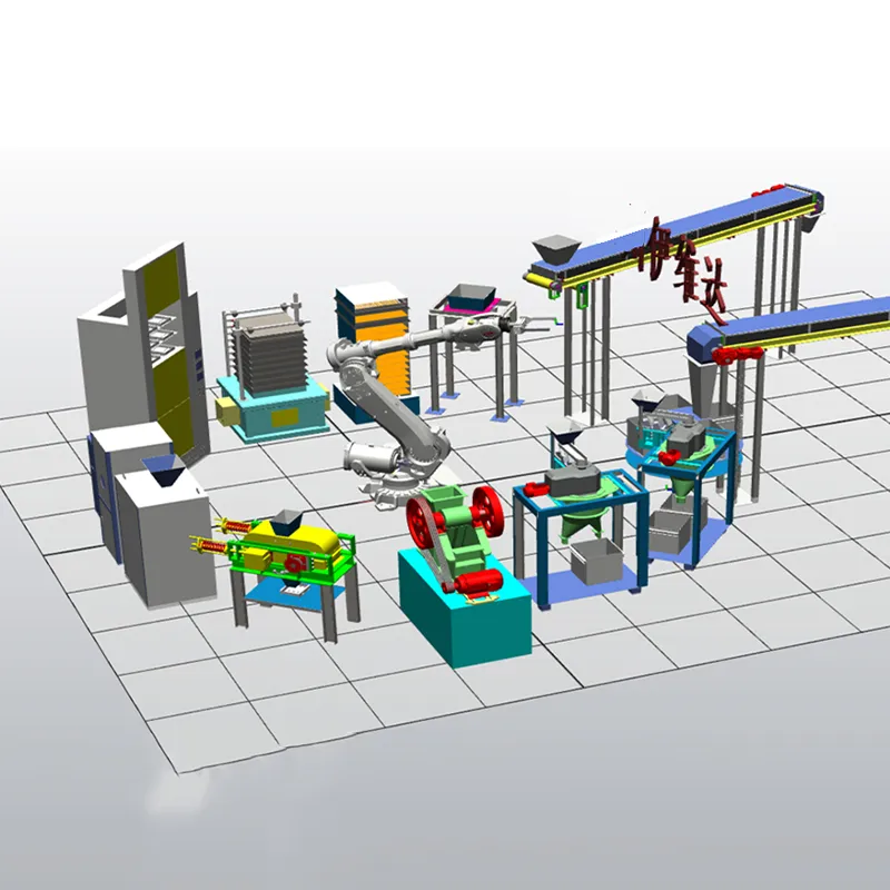 Интеллектуальная система подготовки проб железной руды с помощью роботов включает в себя ленточный конвейер для подачи проб, пробоотборник, дробилку, электронные весы, вибрационный грохот, решетчатый каркас, очиститель, сушильный шкаф, сборщик проб, робот, ленточный конвейер для отходов, упаковочное оборудование и т. д. Все функциональные устройства размещены вокруг робота. Робот захватывает образцы в соответствии с рабочими потребностями, перемещается между различными устройствами и выполняет такие операции, как подготовка образцов, просеивание, анализ и определение влажности.