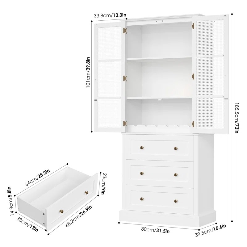 ПРОЧНЫЙ И НАДЕЖНЫЙ: этот высокий шкаф для хранения вещей изготовлен из высококачественных деревянных панелей и имеет прочное основание, обеспечивающее прочность и долговечность, а также крепление к стене для дополнительной устойчивости. Он предназначен для повседневного использования.