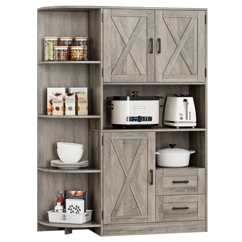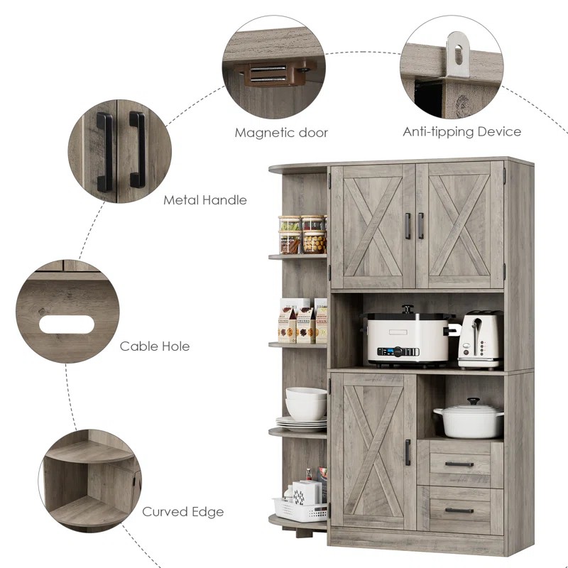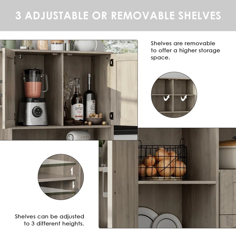 УЛУЧШИТЕ ХРАНЕНИЕ НА КУХНЕ: этот универсальный сервант оснащен вместительными отделениями, тремя шкафами, каждый из которых оснащен регулируемыми полками, четырехъярусной внешней полкой и двумя легко выдвижными ящиками. Здесь предусмотрены как открытые, так и скрытые пространства для удобной организации всех кухонных приборов и принадлежностей для приготовления пищи.