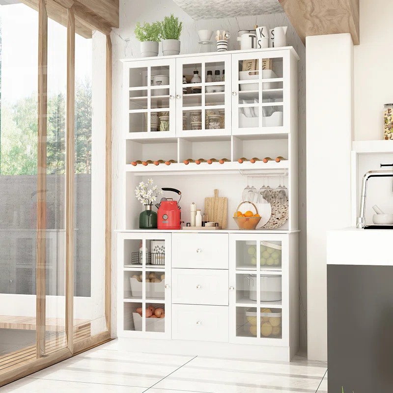 УЛУЧШИТЕ ХРАНЕНИЕ НА КУХНЕ: этот универсальный сервант оснащен вместительными отделениями, тремя шкафами, каждый из которых оснащен регулируемыми полками, четырехъярусной внешней полкой и двумя легко выдвижными ящиками. Здесь предусмотрены как открытые, так и скрытые пространства для удобной организации всех кухонных приборов и принадлежностей для приготовления пищи.