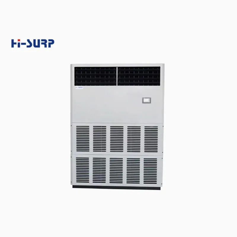 В установках типа подачи сверху воздух распределяется по воздуховодам. Пользователь может гибко выбрать способ подачи воздуха и оптимально расположить количество воздухораспределителей в соответствии с условиями помещения и потребностями, что удовлетворяет требованиям централизованного управления и равномерного контроля температуры в больших пространствах. Способ забора воздуха, в свою очередь, подразделяется на передний (для самостоятельного большого помещения с непосредственным забором воздуха, исключая необходимость в рециркуляционных воздуховодах и машинном отделении) и задний (для централизованной подачи и забора воздуха в нескольких независимых помещениях, требующий устройства рециркуляционных воздуховодов в каждом помещении и машинного отделения для агрегата).