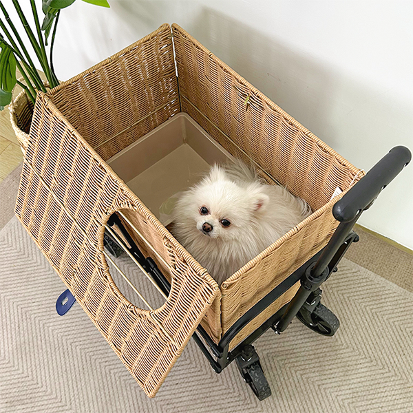Складная тележка для перевозки домашних животных KD: изготовлена из экологически чистого полиэтиленового ротанга, плетеного железом, в сочетании с нижним фрикционом из алюминиевого сплава. Плетеный ящик изготовлен из железного каркаса, полиэтиленового ротанга и полиуретановой кожи, а нижнее сиденье тележки изготовлено из алюминиевого сплава и полипропиленовых колес. Ящик разделен на несколько зон: зону для животных и зону для хранения. Крышка коробки надежно закреплена и удобна в использовании, благодаря высококачественным пряжкам из искусственной кожи. Когда ящик не используется, его можно сложить, а основание из алюминиевого сплава с выдвижной штангой также можно сложить, что очень удобно и экономит место, независимо от того, храните ли вы его дома, в путешествии или в автомобиле.