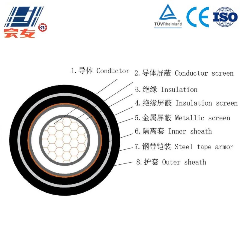 3. Изоляционный слой из сшитого полиэтилена: химически сшитая структура формирует трехмерную сетку, рабочая температура до 90℃, высокая электрическая прочность изоляции, малые потери в диэлектрике, устойчива к старению и химической коррозии, подходит для средневольтных сетей.