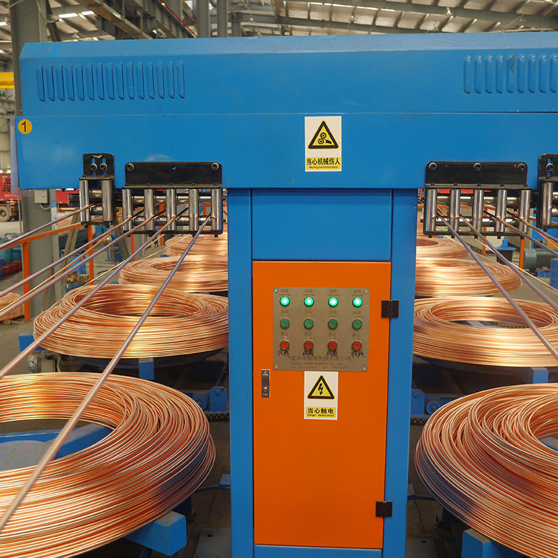 Поместите медный катод в печь с помощью подъемной системы для запекания → отрегулируйте скорость подачи в соответствии со скоростью литья. Подать медный катод в плавильную печь для плавления (уголь должен быть использован для предотвращения окисления) → медная жидкость течет в переходную часть (уголь все еще необходим для предотвращения окисления) → медная жидкость течет в печь удержания → медная жидкость течет в кристаллизатор для получения медных стержней → медные стержни входят в тяговое устройство для движения вверх → проходят через выходную раму → медные стержни проходят через распределительную раму (для разделения каждого стержня) → медные стержни проходят через натяжную раму (для контроля скорости взятия скорость подъема) → медные стержни проходят через машину подъема, для намотки → Следующий процесс