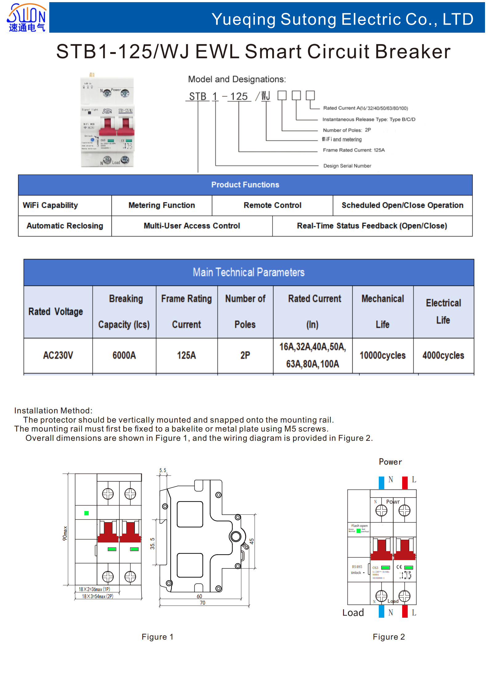 STB1-125系列WIFI带计量智能断路器适用于交流50Hz,联合易微联APP平台使用,额定工作电压230V,额定工作电流100A 及以下的用户或负载中,具有过载及短路保护功 能,手机远程控制断路器分合闸,手机实时显示 断路器分合闸状态、定时、延时多人分享控制外 形美观、性能优良可靠,分断能力较高,脱扣迅速, 模数化导轨式安装