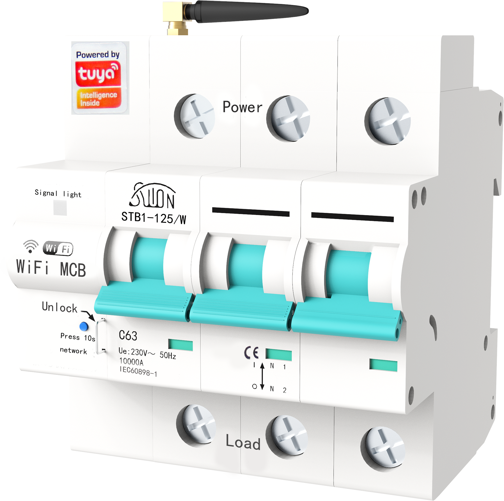 STB1-125/W智能断路器适用于交流50Hz,额定工作电压230/400V,额定工 作电流100A及以下的用户或负载中,具有过载及短路保护功能,手机远程控制断路器分合闸,手机实时显示断路器分合闸状态、定时、 延时多人分享控制,外形美观、性能优良可靠,分断能力较高,脱扣迅 速,模数化导轨式安装。 主要用于家庭、学校、医院、商场、办公楼、灌溉、农场、抽水 泵、出租房等用电设备的远程控制。