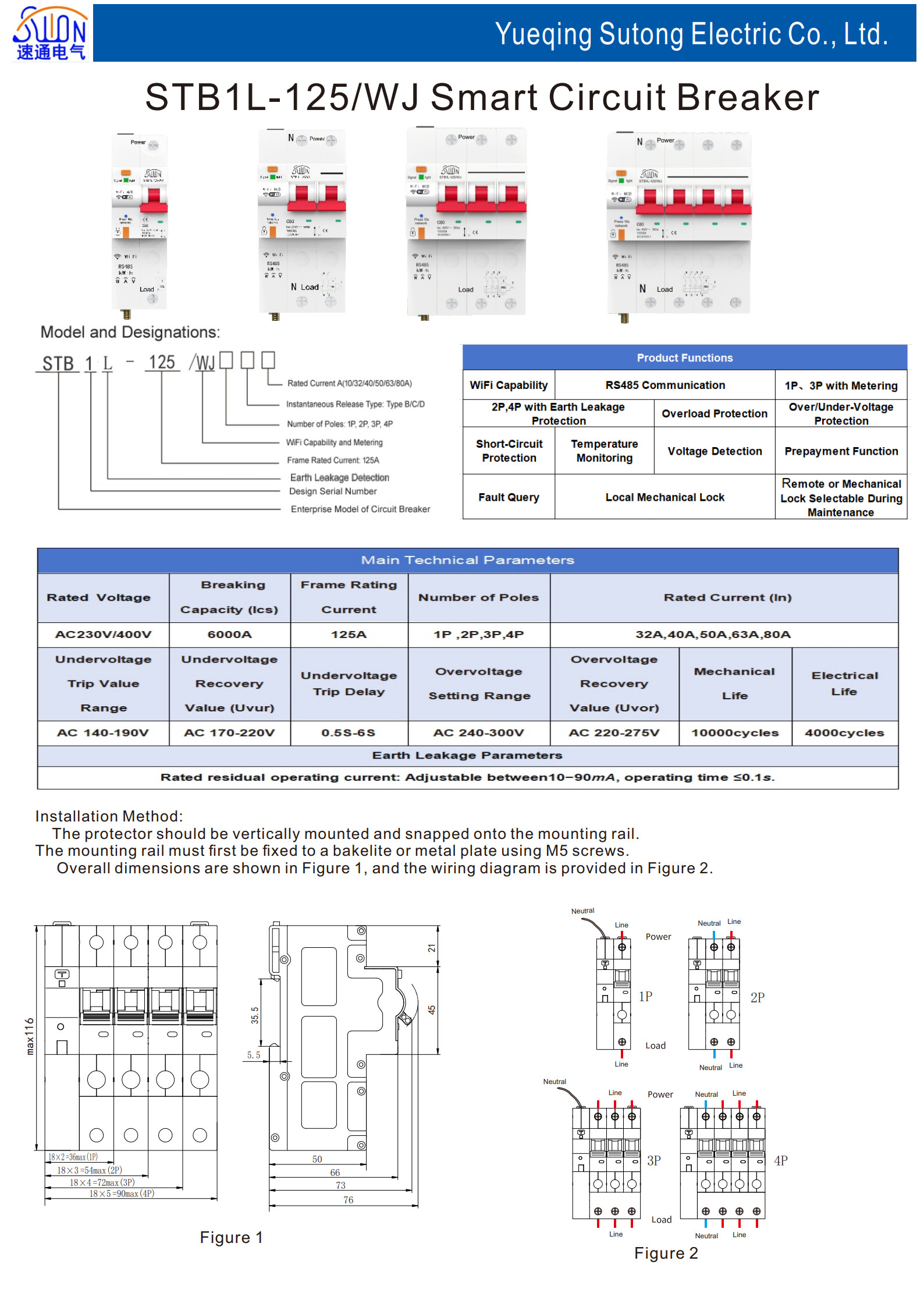 STB1L-125/WJ系列RS485断路器适用于交流50/60Hz,额定工作电压230/400V,额定工作电流80A及以下的用户或负载中,当线路中出现过欠压(设定过欠压)时对用电设 备进行保护;同时具有过载及短路保护功能,外形美观、 性能优良可靠,分断能力较高,脱扣迅速,可实现远程控 制,产品模数化导轨式安装。