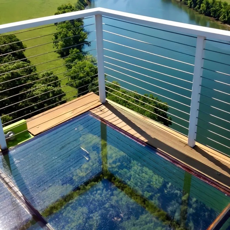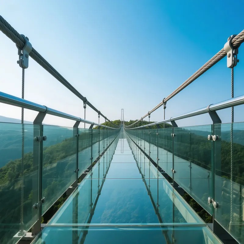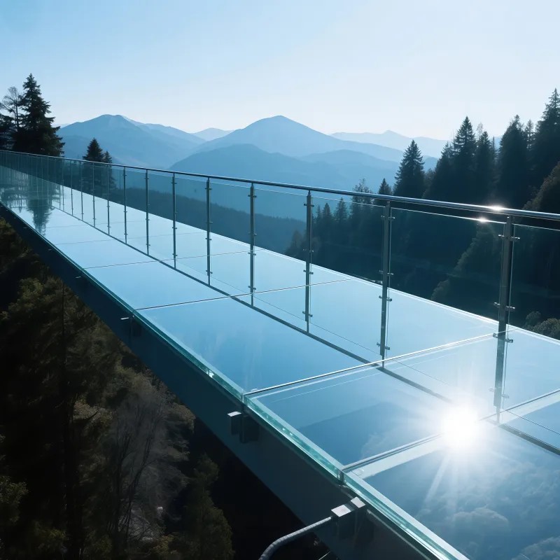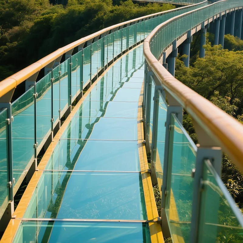 Типичная конфигурация: 3 слоя закаленного стекла + 2 слоя PVB пленки, общая толщина ≥38 мм (например, стеклянная тропа на горе Байшишань).