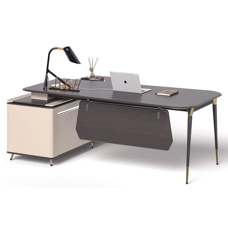 Система хранения с разделением: левая сторона оснащена тремя ящиками (включая один запирающийся ящик с защитой от взлома), а правая — открытыми отсеками для документов и закрытыми шкафами для сортировки документов и хранения канцелярских принадлежностей. Ящики оснащены бесшумными направляющими с мягкими накладками для плавного открывания и закрывания.