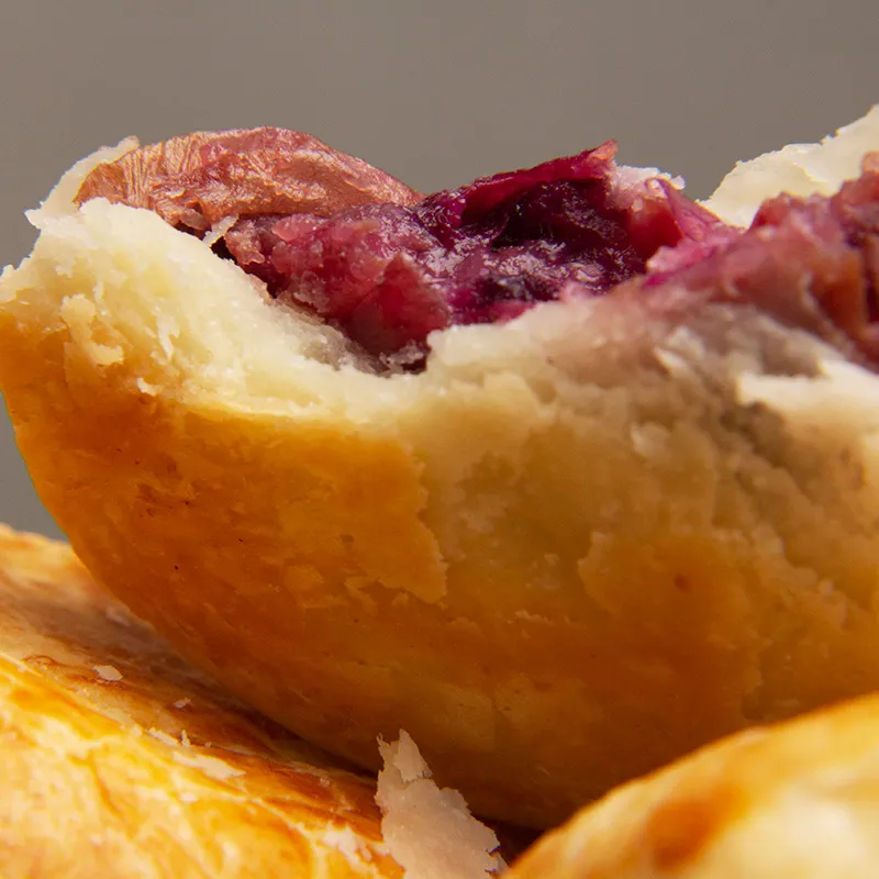 В качестве начинки используются свежие съедобные лепестки роз, которых достаточно много, чтобы каждая порция радовала нежностью. Ароматная хрустящая корочка плотно заключает начинку, и ещё до укуса ощущается розовый аромат. При укусе тесто рассыпается, начинка сладкая, но не приторная, а насыщенный аромат розы раскрывается во рту, словно цветы расцветают на языке, сочетая чарующий запах и нежную текстуру, мгновенно покоряя вкусовые рецепторы.