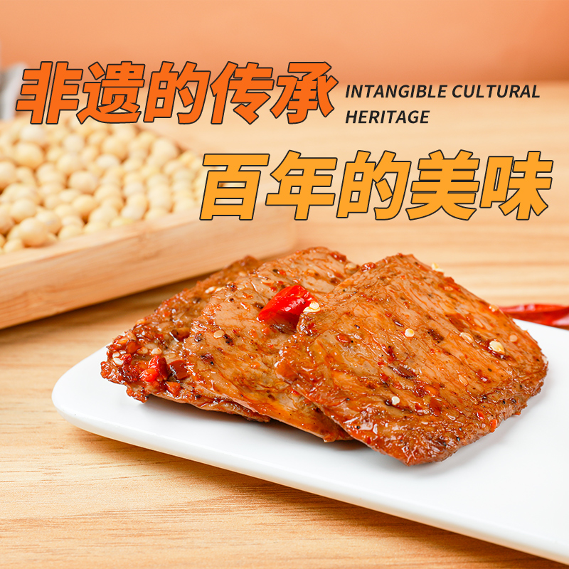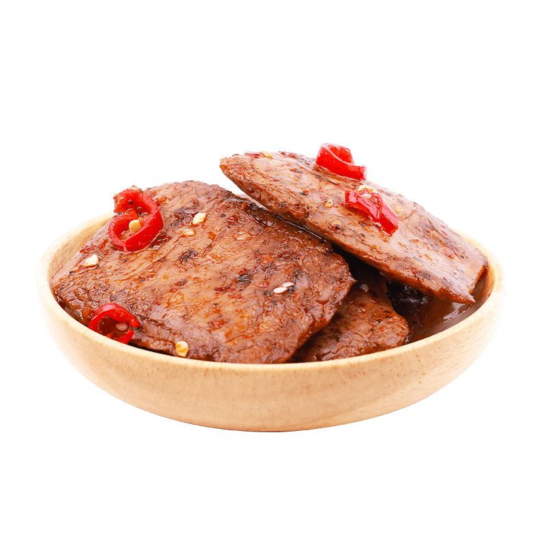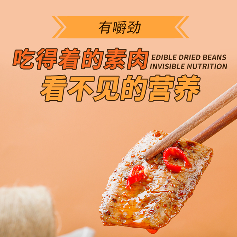 Продукт изготовлен из волокнистого белка ткани в качестве основного сырья путем регидратации, дегидратации, жарки, обезжиривания и других процессов. Готовый продукт имеет форму хлопьев, а цвет: темно-коричневый для вкуса пяти специй, ярко-красный для пряного и барбекю вкусов и светло-белый и желтоватый для маринованного перца. Продукт жевательный и имеет текстуру, близкую к текстуре мясных волокон, и богат растительным белком. Характеристики продукта измеряются и взвешиваются, а вкусы в основном включают вкус пяти специй, пряный вкус, вкус барбекю и вкус маринованного перца. Этот продукт в основном используется в качестве повседневной закуски, готовой к употреблению после открытия пакета, а также может использоваться в качестве гарнира к блюдам и портативен для путешествий.