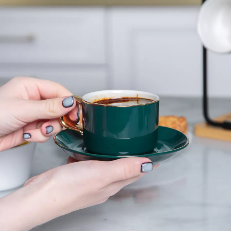 Темно-зеленый набор из чашки, блюдца и ложки с золотым ободком кофейная чашка