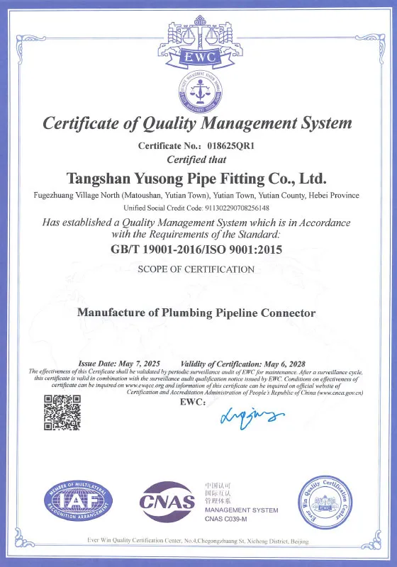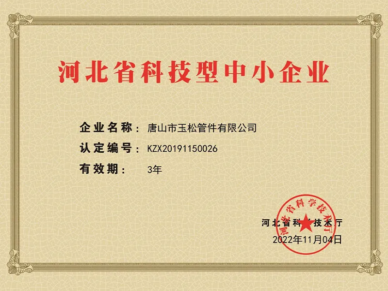 ООО Таншань Юйсун трубопроводные фитинги, основанное 24 мая 2013 года, является специализированным предприятием по производству соединений для трубопроводов из малабильного чугуна. Компания обладает выгодным географическим положением и развитой транспортной доступностью.Общая площадь территории предприятия составляет 22 му (около 1,47 га). Стоимость основных средств достигает 10 миллионов юаней. Годовой объем производства составляет 10 000 тонн оцинкованных резьбовых фитингов из малабильного чугуна номинальным диаметром от DN15 до DN100.