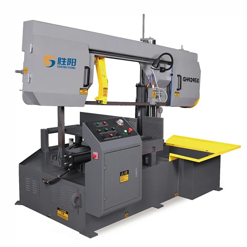 Угловой ленточнопильный станок модели GH4245X специально разработан для прямой и угловой резки профилей различных крупных размеров. Конструкция с основной стойкой в сочетании с вспомогательной обеспечивает более стабильную резку; сквозной гидравлический цилиндр зажимает заготовку, что более удобно и быстро; пильная рама может качаться, образуя угол резки с заготовкой, и опускается в направлении позади зажимных тисков, предотвращая скатывание заготовки после ее резки; вспомогательная подающая рама поддерживает длинные заготовки, облегчая подачу.