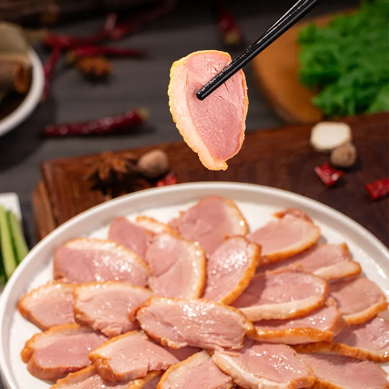 Мастерство исполнения, интерпретация европейского колорита. Этот продукт представляет собой тщательно обработанную копченую утиную грудку весом нетто по 200 г, стандартная упаковка - 10 кг/коробка. Мы поддерживаем гибкую настройку стилей упаковки и технических характеристик продукции для удовлетворения разнообразных потребностей клиентов. Отборные утки из высококачественной утиной грудки "Черри Вэлли", очищенные от кожуры, маринуются по-научному и профессионально обваливаются, чтобы специи проникли в текстуру.Для медленного копчения при низкой температуре используются натуральные яблочные опилки, при этом в процессе копчения строго соблюдаются стандарты термической обработки экспортируемых продуктов, что обеспечивает их безопасное созревание и придает им мягкий фруктовый аромат. Готовый продукт проходит тщательную проверку, упаковку по самым высоким стандартам, быстрое сохранение в свежем виде, обнаружение металла и другие процедуры контроля качества, прежде чем его можно будет упаковать и отправить с завода.Этот продукт также может быть непосредственно переработан в готовые к употреблению нарезанные изделия в соответствии с потребностями клиента, а после вскрытия упаковки может быть использован для приготовления блюд общественного питания. Этот продукт можно нарезать и употреблять в пищу сразу после размораживания. Он подходит для приготовления мясного ассорти или гарниров. Его также можно нарезать кубиками и добавлять в салаты, поскольку он является высококачественным белковым дополнением к рису и лапше. Вкус становится лучше после небольшого обжаривания или запекания, а подгоревшая кожица дополняет нежность утки. мясо. Оно подходит для различных вариантов употребления, таких как приготовление легких закусок, самообслуживание в отелях и семейные посиделки. В настоящее время копченая утиная грудка экспортируется в Японию и Южную Корею, Европу, Гонконг, Юго-Восточную Азию и Австралию и пользуется большим признанием и любовью.