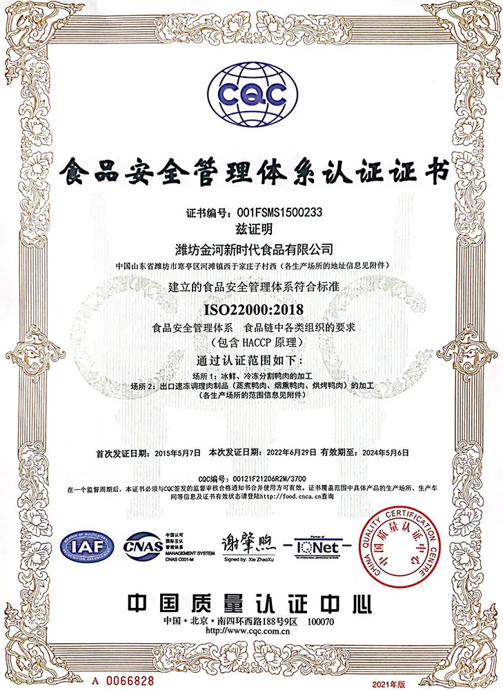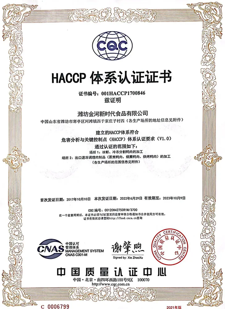 ООО Вэйфан Цзиньхэ Новая Эра по Пищевой Продукции было основано в 2003 году с уставным капиталом 164 674 030 юаней. Компания работает как интегрированное предприятие с полной производственной цепочкой, включая разведение и инкубацию птицы, коммерческое выращивание уток, забой и переработку мясных уток, производство готовых мясных продуктов, продажу продукции и экспортную торговлю. Компания управляет одним дочерним предприятием по разведению уток, девятнадцатью фермами по разведению мясных уток, одним заводом по убою и переработке мясных уток, одним заводом по переработке утиного мяса и одним заводом по переработке готовых продуктов питания.