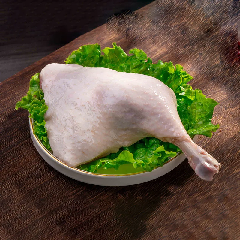 Целая утиная ножка без участка позвоночника. Мышцы хорошо развиты, слой жира толстый.