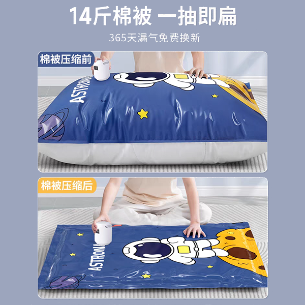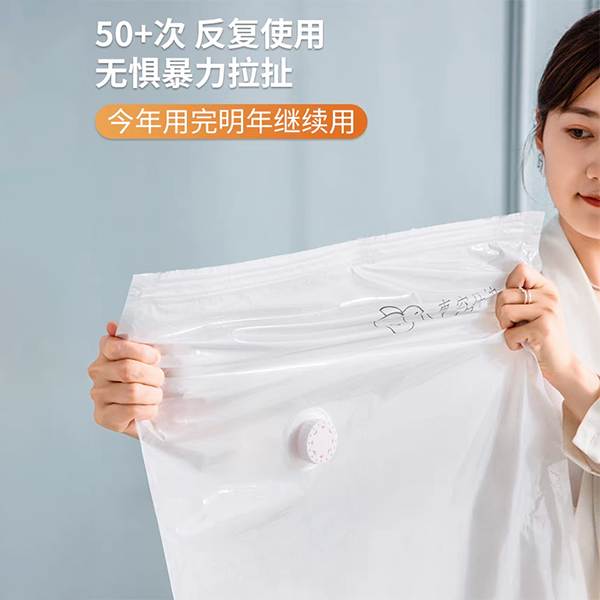 1. Вакуумный компрессорный мешок: уменьшение объема путем вытягивания воздуха (экономия пространства на 80%), влагонепроницаемость, подходит для одеял, пуховиков и других пушистых предметов.Технические параметры: толщина материала PA + PE 80 - 120 мкм, вакуум - 0,08 МПа, вертикальная несущая нагрузка 5 кг без утечки воздуха.