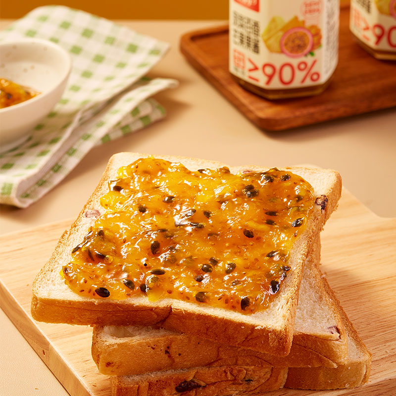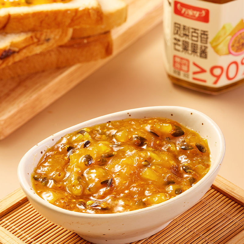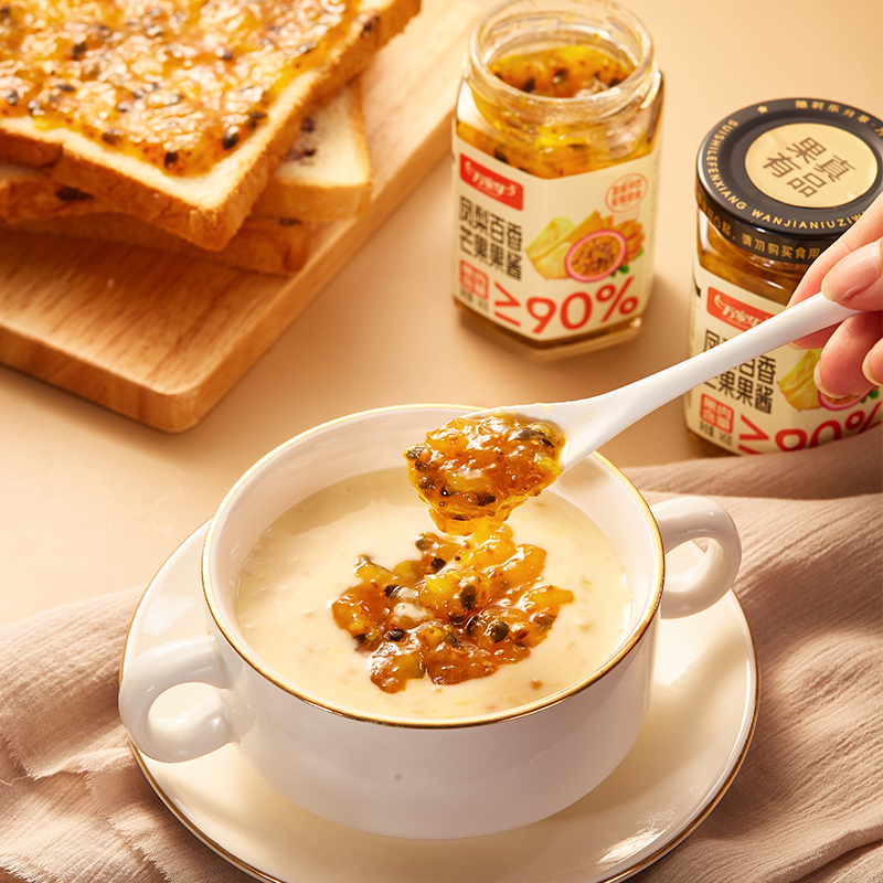 Состав: манго (добавка ≥45%), маракуйя (добавка ≥30%), ананас (добавка ≥15%), жёлтый сахар, семена чиа (добавка <4%)