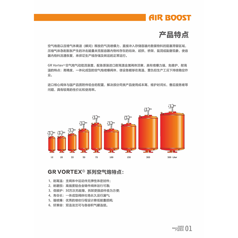 Полностью металлическая поршневая воздушная пушка предназначена для использования при температуре окружающей среды от -40 °C до 60 °C и температуре материала от 0 °C до 1400 °C в контейнерах различной формы, таких как квадратные или круглые бункеры, воронки, трубопроводы для подачи материала, а также шахтные желоба и т. д. Она широко используется в портах, цементной, металлургической, химической, угольной, электроэнергетической, горнодобывающей, сталелитейной и других отраслях промышленности. Он отличается низким энергопотреблением, небольшими инвестициями, простотой обслуживания и является высокоэффективным, экологичным и энергосберегающим продуктом для устранения заторов и облегчения потока.