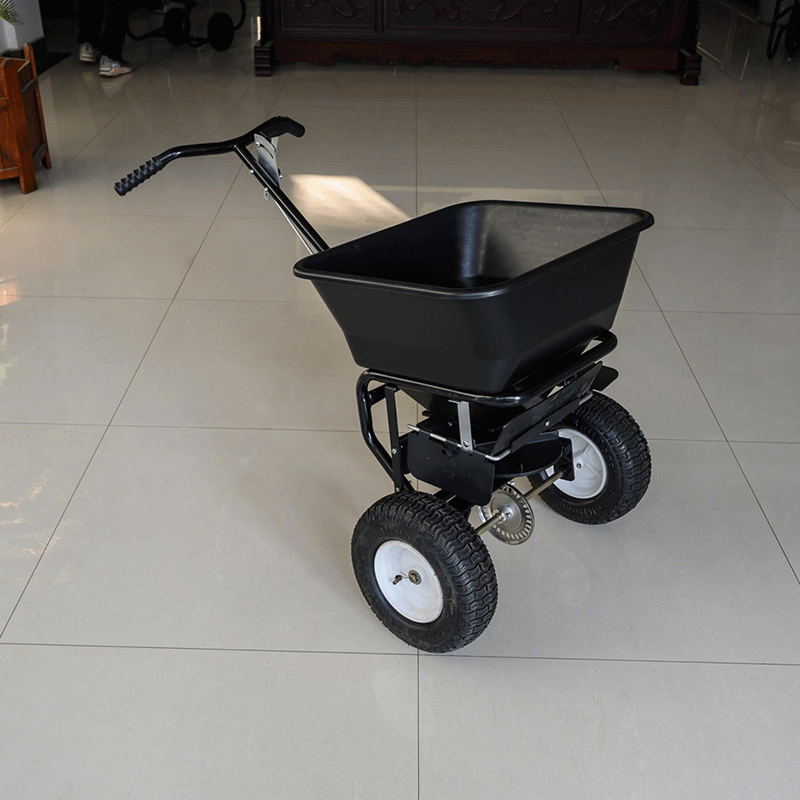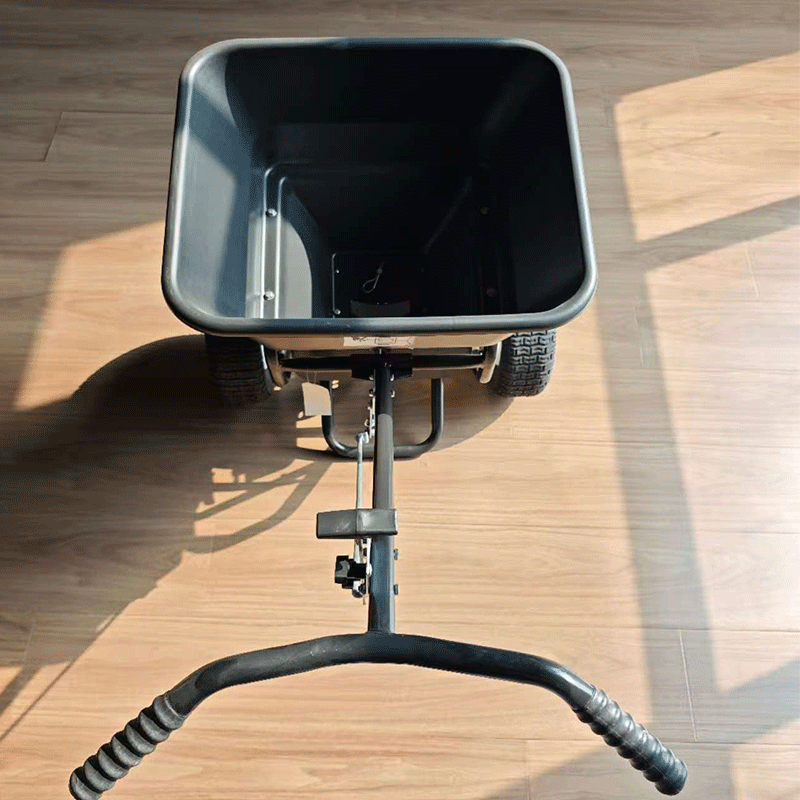 Ручная тележка для удобрений - это небольшой или средний инструмент, предназначенный для борьбы с обледенением и таянием снега на небольших территориях, подходящий для различных сценариев, таких как населенные пункты, частные дома, автостоянки, тротуары и многое другое. Габариты изделия составляют всего 1020 мм*810 мм*650 мм (после установки), а вес - 15 кг, что не давит при использовании одним человеком. При использовании, вам нужно только засыпать снеготаяние и другие гранулированные материалы в бункер, с которым фильтр автоматически отсеет чрезмерно крупные частицы, объем бункера составляет около 50 литров, а затем отрегулировать скорость материала с помощью ручки управления на руле, а затем вам нужно только толкать его с постоянной скоростью, разбрасыватель соли будет равномерно распределять гранулированный материал, и вы можете настроить перегородки вокруг дна бункера, чтобы контролировать площадь разбрасывания. Скорость разбрасывания зависит от скорости толкания. Шины - пневматические шины из чистой резины, размер 13*5.00-6, со спицами из пластика, устойчивого к низким температурам. Конечно, шины могут быть заменены на цельные шины с железными спицами в соответствии с требованиями клиентов. Корпус ручного разбрасывателя соли общего типа изготовлен из высокопрочной стали и имеет антикоррозийный слой на поверхности. Остальные металлические части машины оцинкованы и могут противостоять коррозии в течение более 500 часов. Изделие поставляется в одной коробке с инструкцией на английском языке и легко устанавливается, для завершения сборки необходимо только установить руль.