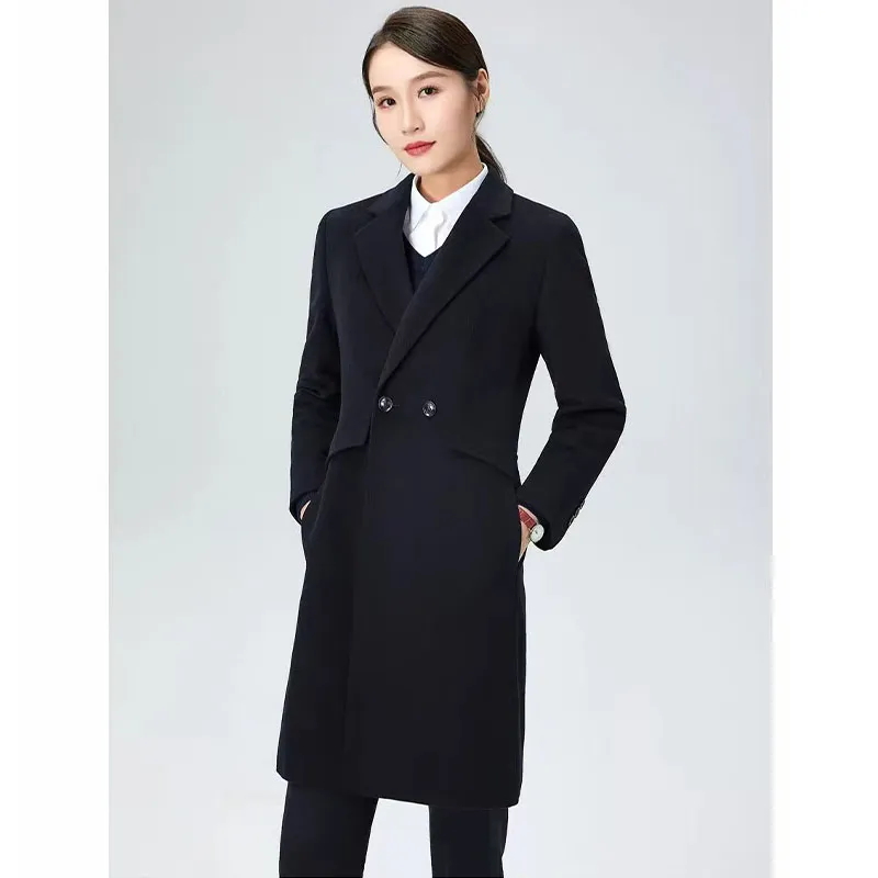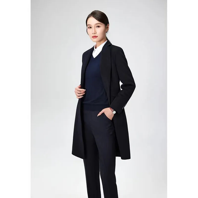 Пальто длиной примерно до колен, его плавные линии изящно повторяют контуры фигуры. Оно обеспечивает баланс между профессиональной сдержанностью, необходимой на рабочем месте, и комфортом повседневной носки. Цветовой контраст, созданный сочетанием с белой рубашкой, добавляет ярко выраженное ощущение многослойности. Вставные карманы ненавязчиво придают образу непринужденность, а детали двубортного кроя подчеркивают общую утонченность образа.