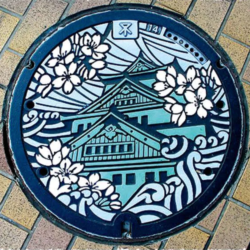 Художественный люк из чугуна с шаровидным графитом использует чугун с шаровидным графитом в качестве основы, с нанесением цветного покрытия в соответствии с требованиями дизайна рельефного рисунка на поверхности люка, формируя таким образом многоцветный художественный люк, обладающий такими преимуществами, как высокая несущая способность и изысканное изготовление, и являющийся универсальным художественным люком мирового уровня.