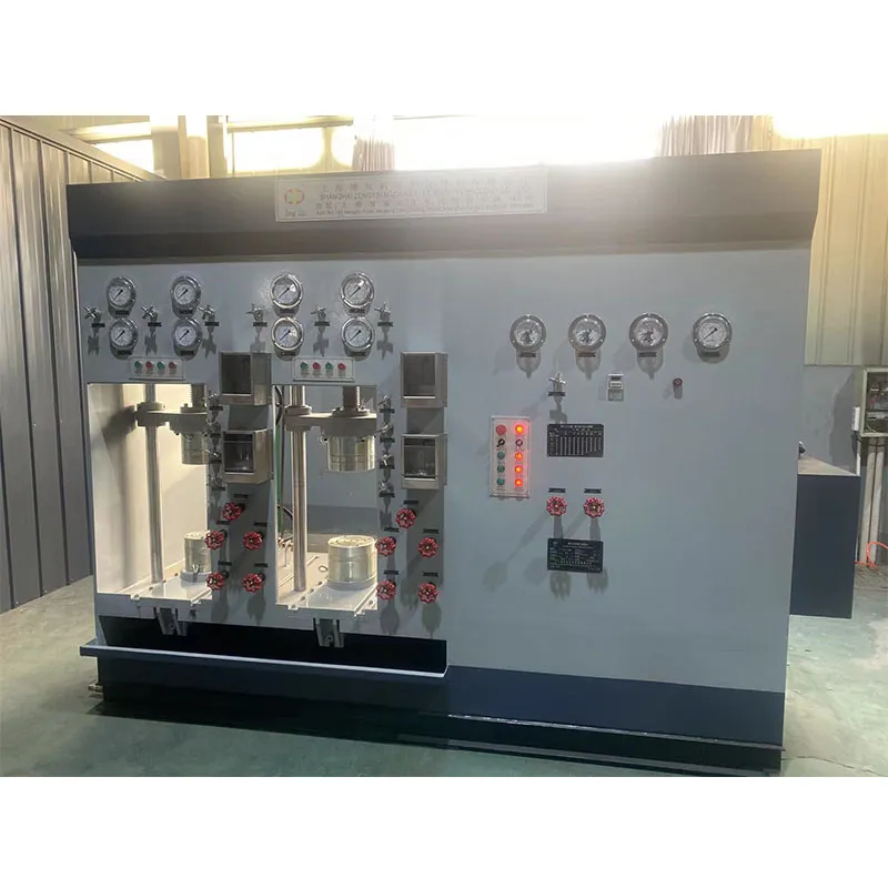 Основой работы данного оборудования является вертикальная передача механического усилия. В процессе эксплуатации высокопрочный винт, расположенный в верхней части конструкции, приводится во вращение электродвигателем силового привода, перемещая верхнюю уплотнительную плиту вертикально вниз. Испытываемая арматура устанавливается горизонтально на нижнее уплотнительное основание. Создаваемое винтом осевое прижимное усилие передается через верхнюю плиту на верхний фланец арматуры, плотно прижимая ее к нижнему основанию. Уплотнительные элементы на верхней и нижней плитах деформируются под воздействием нагрузки, обеспечивая надежную осевую герметизацию фланцев с обоих торцов, что создает необходимые условия для последующего нагнетания давления и проведения испытаний.
