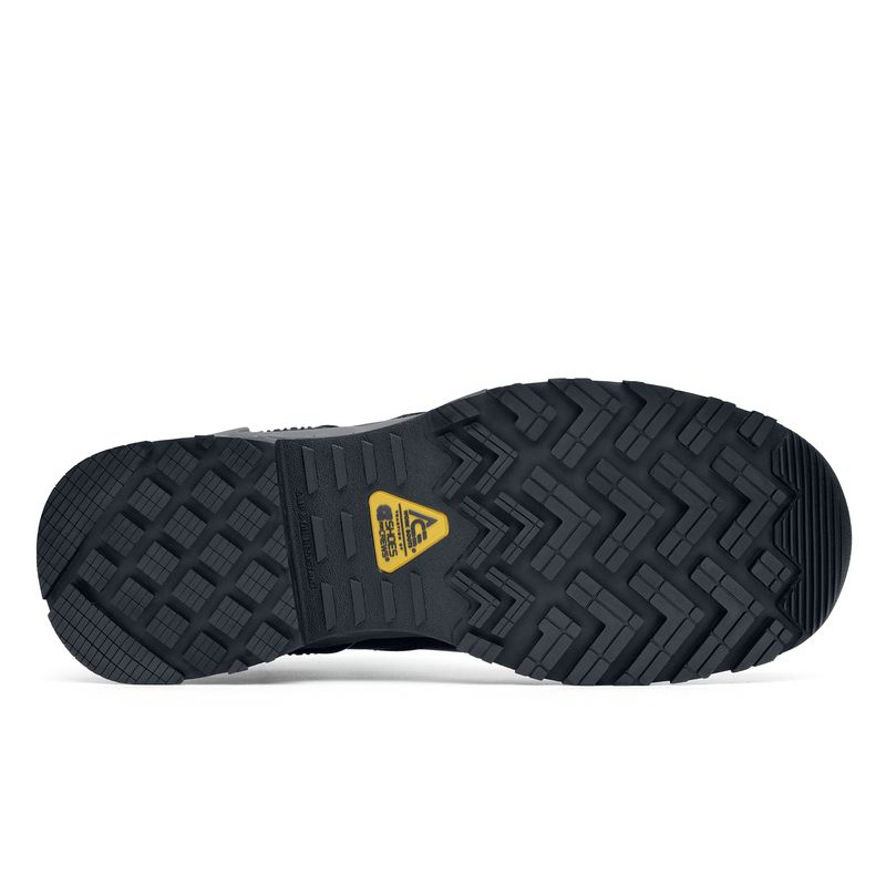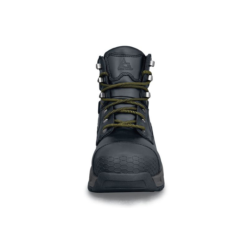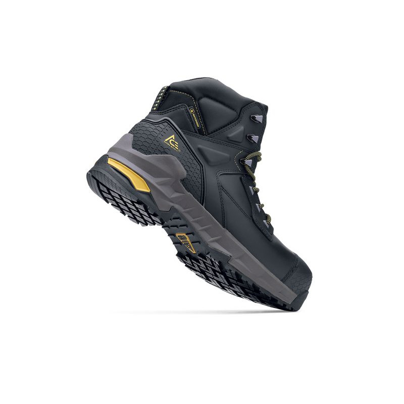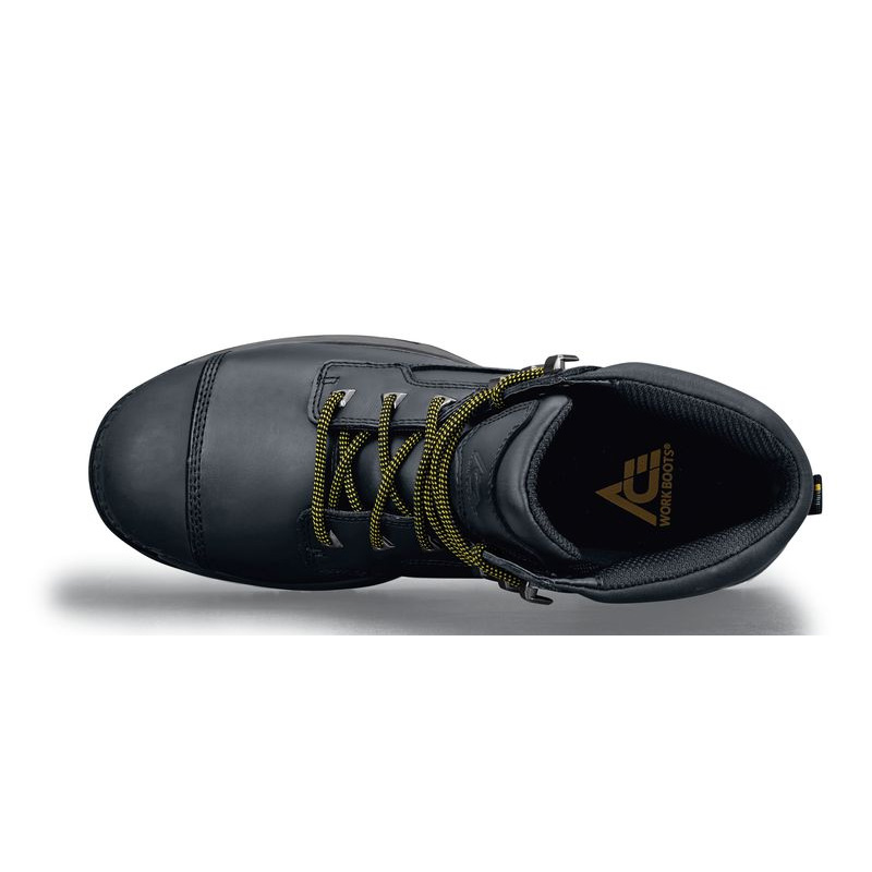 Это защитные ботинки с высоким верхом, предназначенные для сложных условий работы и активного отдыха. Верх ботинок изготовлен из высококачественной черной кожи, прочной и износостойкой, устойчивой к царапинам и потертостям, и украшен желтым логотипом бренда для дополнительной визуальной привлекательности и узнаваемости бренда.
