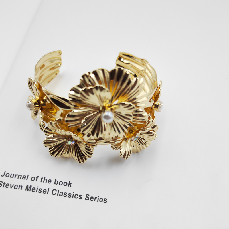 Это золотой браслет, выполненный из железа, с формой цветка в качестве изюминки дизайна, а центр цветка инкрустирован жемчугом, что в целом представляет собой нежный и великолепный легкий европейский и американский стиль.Его мастерство отличается изысканностью, металлическая текстура и тепло жемчуга контрастируют друг с другом, подходят для сочетания со всеми видами одежды, придавая элегантность общему образу.