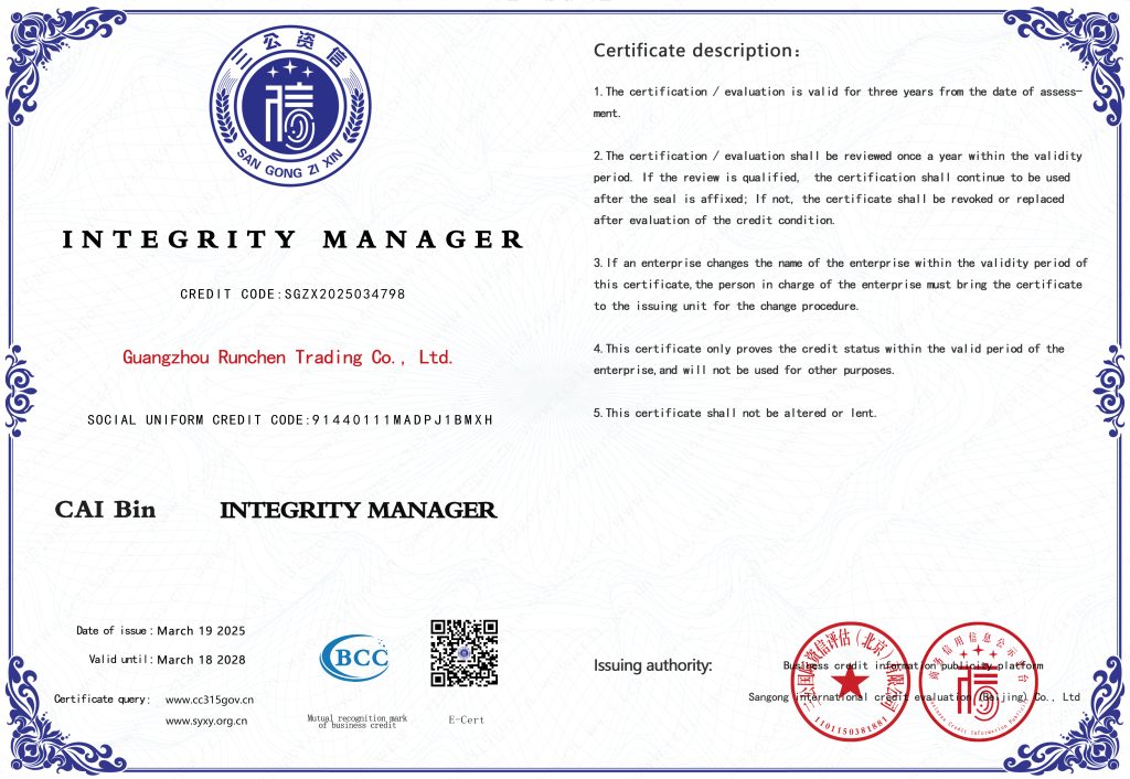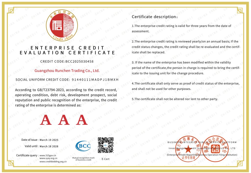 Компания ООО Гуанчжоу Жуньчэнь Коммерция успешно заняла место на мировом рынке благодаря своим превосходным возможностям управления цепочками поставок и оптимизации услуг. Компания не только предоставляет китайским предприятиям возможность расширить международный рынок, но и строит удобный мост для выхода иностранных предприятий на китайский рынок, а также осуществляет взаимовыгодное и беспроигрышное деловое сотрудничество.